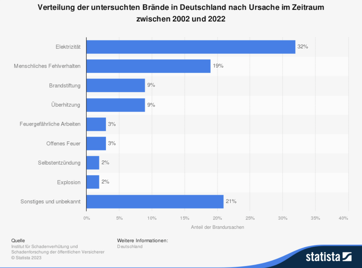 Laut dem Institut für Schadenverhütung und Schadenforschung der öffentlichen Versicherer ist Elektrizität die häufigste Brandursache.