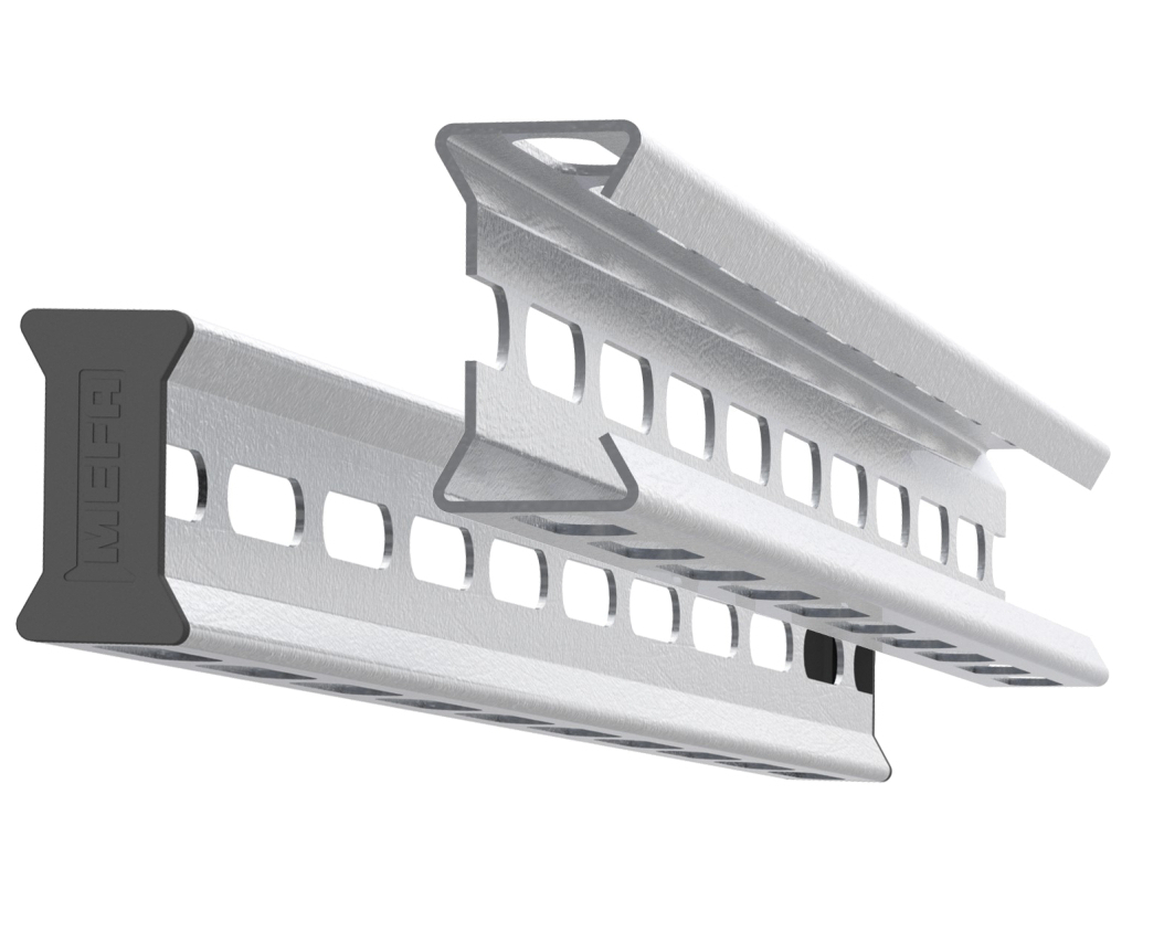 Der Befestigungstechnikhersteller Mefa hat ein Schienensystem für den Lüftungsbauer entwickelt, das bei normgerecht berechneter Tragfähigkeit 30 % Stahl und damit auch CO2 in gleicher Größenordnung einspart. Die Schiene „Signum LP 50“ mit spezieller Trägergeometrie ist gefalzt und erinnert an das Summenzeichen aus dem griechischen Alphabet und sei damit – hochkant montiert – auf Biegesteifigkeit optimiert. Die Schiene aus verzinktem Stahl muss laut Hersteller hochkant verbaut werden; also seitlich offen wie ein C. Sie dient, zwischen Gewindestangen abgehängt, als Quertraverse für Lüftungskanäle in der typischen „Affenschaukel“ oder als Auflage für Steigkanäle mittels Wandanbindung. Die Schiene ist in Längen von 2 und 6 Metern verfügbar. Dazu gibt es eine Schutzkappe für die Enden, eine Schallentkopplung für den Luftkanal sowie fertig vorkonfektionierte Wandhalter.