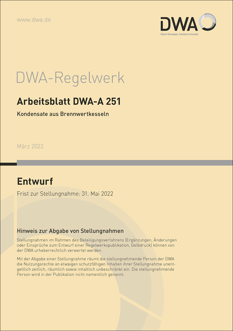 Die sparsame und effiziente Nutzung von Rohstoffen und Energie ist nicht nur ein wirtschaftliches, sondern auch ein umweltpolitisches Ziel. Die Brennwerttechnik, bei der nicht nur die Reaktionswärme der Verbrennung (Heizwert), sondern auch die Kondensationswärme des entstehenden Wassers genutzt wird, dient diesem Ziel. Sie ermöglicht eine erhöhte Energieausnutzung. Die dabei entstehenden Kondensate enthalten teilweise säurebildende Oxide, die zu pH-Werten unterhalb der Grenzwerte der üblichen kommunalen Entwässerungssatzungen führen können. Die DWA hat hierzu das Arbeitsblatt DWA-A 251 „Kondensate aus Brennwertkesseln“ veröffentlicht. Es legt Kriterien für die Einleitung des Kondensats in das öffentliche Kanalnetz fest, um für den notwendigen Bestandschutz abwassertechnischer Anlagen zu sorgen und die bei der Abwasserbehandlung anfallenden Reststoffe (Klärschlamm) vor vermeidbaren Kontaminationen zu schützen. Gegenüber dem Arbeitsblatt DWA-A 251 (11/2011) wurden folgende Änderungen vorgenommen: