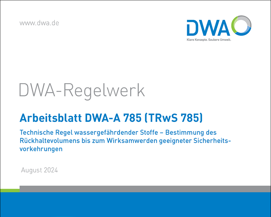 Das Wasserrecht verlangt bei Anlagen zum Umgang mit wassergefährdenden Stoffen, dass austretende wassergefährdende Stoffe schnell und zuverlässig erkannt, zurückgehalten sowie ordnungsgemäß und schadlos verwertet oder beseitigt werden. Das Rückhaltevolumen ist ausreichend, wenn die Rückhalteeinrichtung so bemessen ist, dass sie die austretende Menge an wassergefährdenden Stoffen vom Entstehen einer Leckage bis zu ihrer Beseitigung aufnimmt. Die DWA hat hierzu das Arbeitsblatt DWA-A 785 (TRwS 785) „Technische Regel wassergefährdender Stoffe – Bestimmung des Rückhaltevolumens bis zum Wirksamwerden geeigneter Sicherheitsvorkehrungen“ veröffentlicht. Gegenüber TRwS 785 (7/2009) wurden insbesondere bspw. folgende Änderungen vorgenommen: