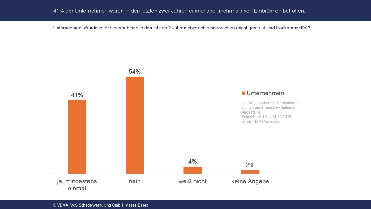 Bei Unternehmen zeigt sich vor allem in Hinblick auf die objektive Bedrohung ein klares Bild: 41 % der befragten Unternehmen berichten von mindestens einem Einbruch in den vergangenen zwei Jahren – gegenüber 12 % bei Privatpersonen. Zudem schätzen 40 % der Unternehmen das Risiko für einen physischen Einbruch als hoch ein und bereiten sich entsprechend vor. „Der Sicherheitsmonitor macht deutlich: Das Bedürfnis nach Sicherheit wächst auf allen Ebenen – vom Privathaushalt bis zum Industrieunternehmen. Als Veranstalter der Sicherheitsfachmesse Security Essen können wir das bestätigen: Wir erleben mit jeder Messeausgabe aufs Neue, wie stark dieses Sicherheitsbewusstsein zunimmt. Die Nachfrage nach physischen und digitalen Lösungen wächst“, sagt Oliver P. Kuhrt, Geschäftsführer der Messe Essen.