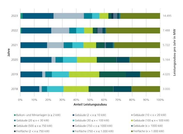 Verteilung des Leistungszubaus von PV-Anlagen nach Leistungsklasse, Anlagentyp und Jahr der Inbetriebnahme.