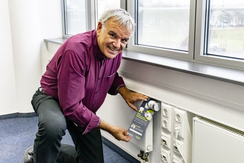 Thomas Meibert, Energiemanagementbeauftragter bei Hübner, an einem Heizkörper mit einem selbstlernenden Thermostat