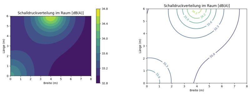 Darstellung der Schalldruckverteilung in einer ausgewählten Raumebene, z. B. auf Ohr-Höhe der im Raum sitzenden Personen
