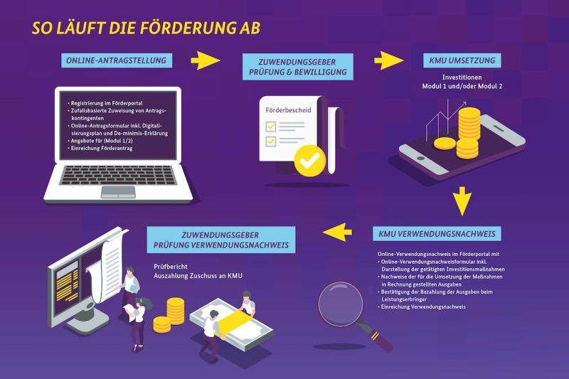 Die Fördermittel gibt es in Form eines Zuschusses zu den entsprechenden Investitionen, der nicht zurückgezahlt werden muss. Beantragen können diesen noch bis 2023 Unternehmen aus allen Branchen einschließlich des Handwerks und der freien Berufe, wenn sie wenigstens drei und höchstens 499 Mitarbeiter beschäftigen.