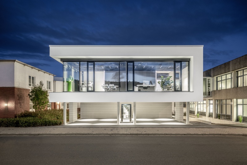Die neue Gebäudehülle wurde von den ortsansässigen Architekten Wellie + Partner entworfen und geplant. Für die Inneneinrichtung zeichnet Sabine Keggenhoff vom Büro Keggenhoff + Partner verantwortlich. Im gesamten Neubau wurde Wert auf Kommunikationsorte sowie eine angenehme Arbeitsatmosphäre gelegt. Bodentiefe Glasfenster unterstützen diese Offenheit. Eine zeitlose und wertbeständige Architektur, die auch die hochwertigen Produkte des Unternehmens widerspiegeln, war die Vorgabe der Bauherrn. Neue Kommunikationsorte für einen schnellen internen Austausch wurden geschaffen, um die Interaktion der Mitarbeiter zu fördern. Dafür sind auch im Außenbereich neue Sitzgelegenheiten geschaffen worden, die sowohl Ruhe als auch Gespräche in angenehmer Atmosphäre zulassen.