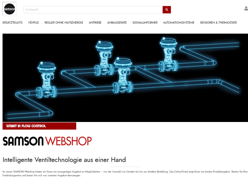 Komponenten und Ersatzteile für Lieferung in Deutschland 16.03.2021Die Samson Aktiengesellschaft ist am 15. März 2021 mit einem neuen Webshop für B2B-Kunden in Deutschland gestartet. Unter webshop.samsongroup.com werden Komponenten wie Ventile, Antriebe, Anbaugeräte, Regler ohne Hilfsenergie, Automationssysteme und Ersatzteile angeboten.