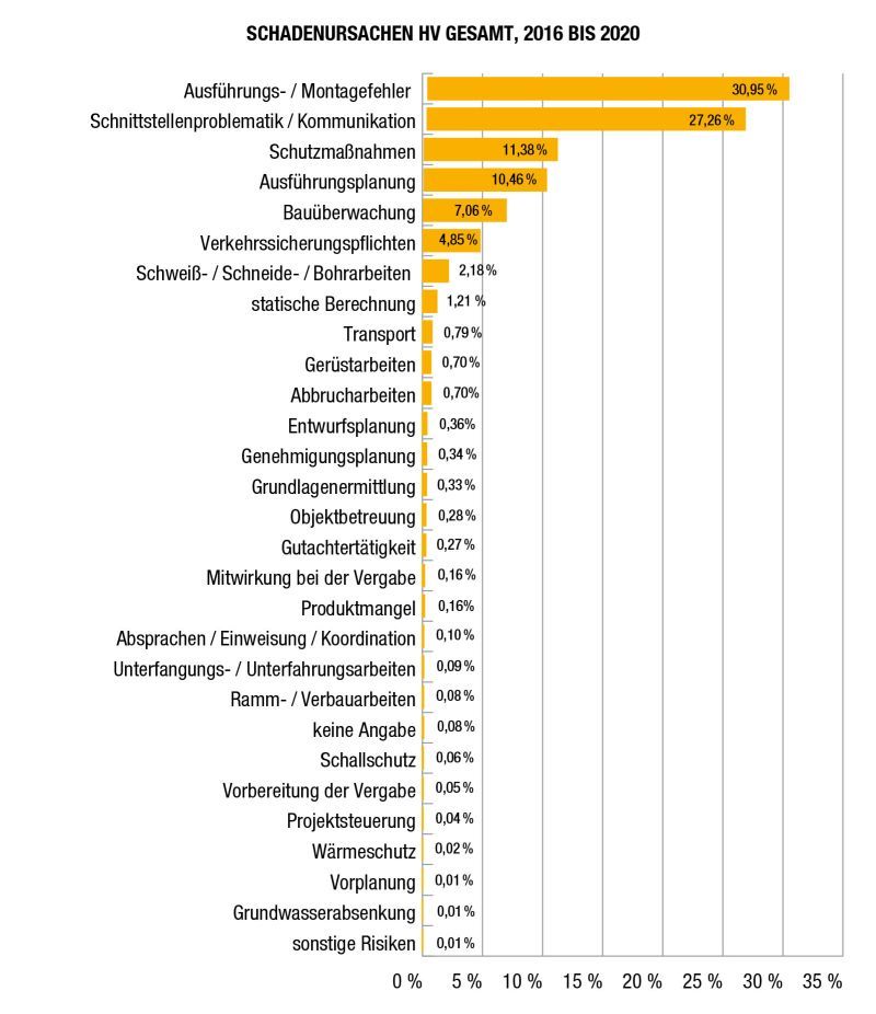Bei den Schadenarten treten unverändert häufig Schäden an der Baukonstruktion auf sowie Wasser- bzw. Feuchteschäden. Bei den Schadenursachen überwiegen Ausführungs- bzw. Montagefehler sowie eine unzureichende Schnittstellenkoordination und mangelhafte Kommunikation. In Gastbeiträgen zeigen namhafte Experten aus der Baubranche mögliche Lösungen auf. So wirkt die Digitalisierung von Planungs- und Bauüberwachungsprozessen bereits mangelpräventiv, zudem trägt sie zur Erhöhung der Bauqualität bei und beeinflusst die Prozesse im Sinne der Wirtschaftlichkeit positiv.