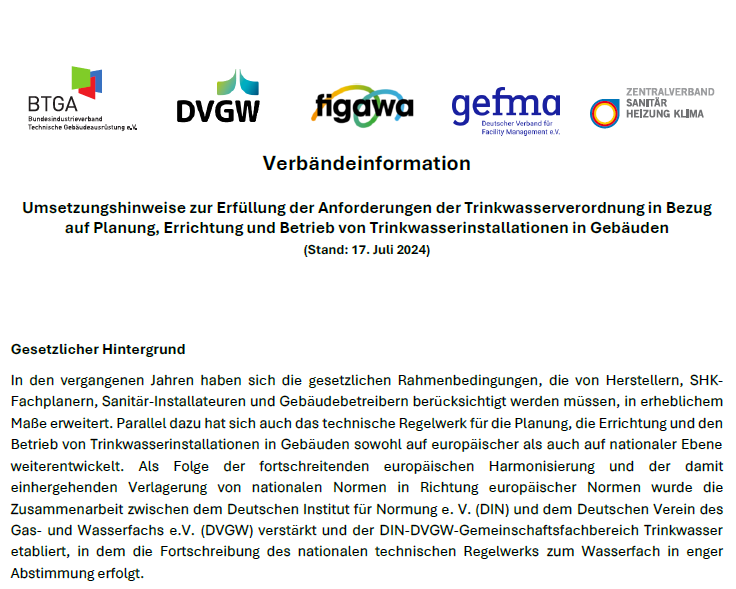 Für Trinkwasser gelten besonders strenge Maßstäbe. Eine Gefährdung der menschlichen Gesundheit ist vorsorgend so weit wie möglich auszuschließen. Daher gilt die Nichteinhaltung von allgemein anerkannten Regeln der Technik in Planung, Errichtung oder Betrieb von Trinkwasserinstallation sofort als Mangel. Die Richtlinienreihe VDI 6023 und weitere VDI-Richtlinien, wie die Reihe VDI 3810, seien ebenso relevant wie die seitens DIN oder DVGW ausgefertigten Regelwerke. Eine hilfreiche Einordnung der aufgelisteten Veröffentlichungen in ein Gesamtbild der Trinkwasserhygiene liefert die Verbändeinformation aus Sicht des VDI nicht.
