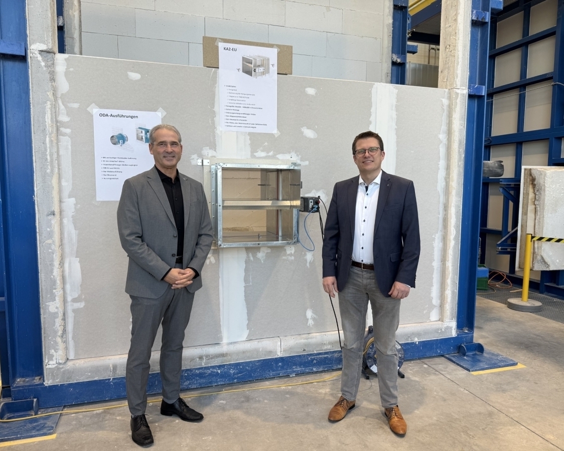 Udo Jung (links), Vorsitzender des VDMA Fachverbands Allgemeine Lufttechnik, wird das Symposium Brandschutz und Entrauchung eröffnen. Martin Mosters, Vorsitzender des VDMA Arbeitskreises Brandschutz und Entrauchung, moderiert die Veranstaltung. Die Brandschutzklappe auf dem Bild wird Gegenstand des Symposiums sein.