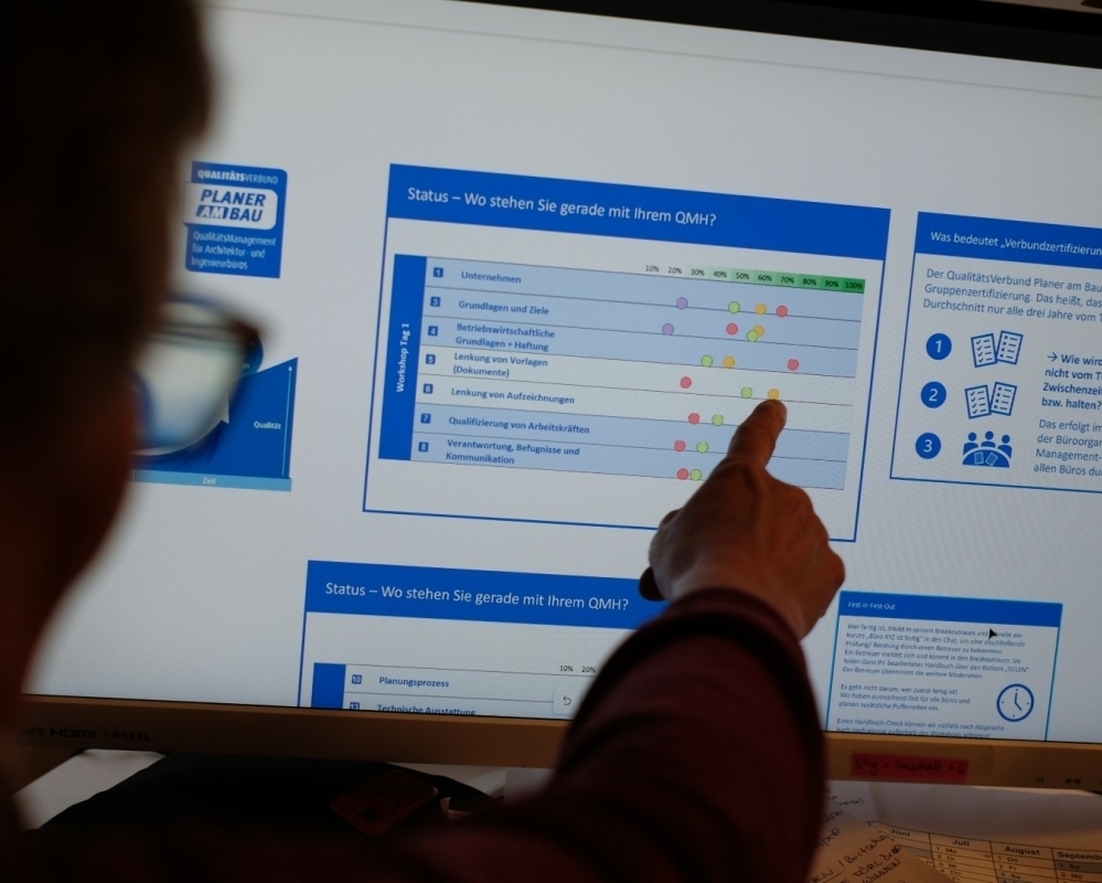 Am 23. und 24. April 2024 findet der virtuelle „QM-Kompakt-Workshop“ für Architektur- und Ingenieurbüros statt. Die teilnehmenden Büros erarbeiten an zwei Tagen die Grundlage für ihr individuelles Büroorganisations- bzw. Qualitätsmanagement-(QM)-Handbuch. Das Ziel des virtuellen Workshops ist es, Architektur- und Ingenieurbüros zur Umsetzung und Erarbeitung ihres Handbuchs eine professionelle und unter Kosten-Nutzen-Gesichtspunkten optimierte Hilfestellung anzubieten. Mit der Unterstützung von Architektin Sylvia C. Schuster und Dr.-Ing. Knut Marhold sollen die wesentlichen und zeitaufwändigsten Teile des erforderlichen QM-Handbuchs zum Erhalt des TÜV-Qualitätszertifikats „Planer am Bau“ ausgearbeitet werden.