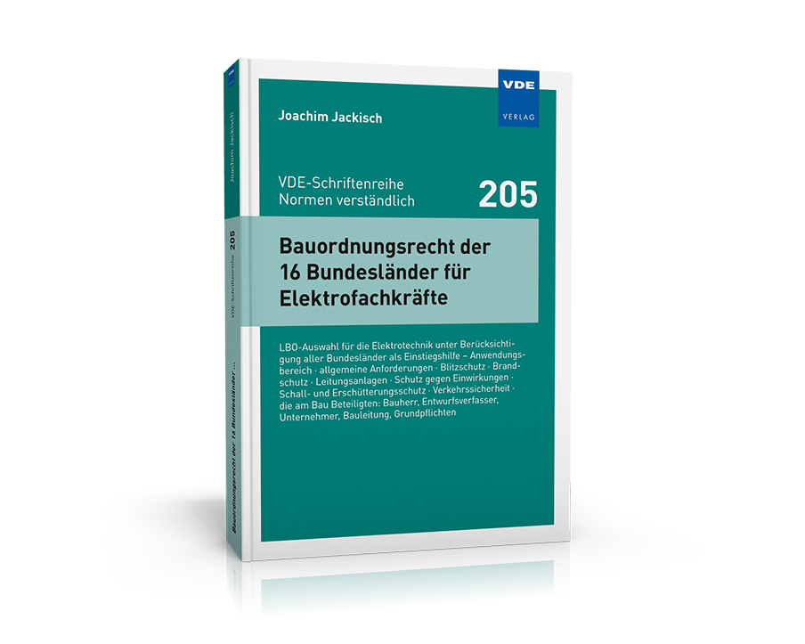 Bauordnungsrecht der 16 Bundesländer für Elektrofachkräfte – LBO-Auswahl für die Elektrotechnik unter Berücksichtigung aller Bundesländer als Einstiegshilfe – Anwendungsbereich · allgemeine Anforderungen · Blitzschutz · Brandschutz · Leitungsanlagen · Schutz gegen Einwirkungen · Schall- und Erschütterungsschutz · Verkehrssicherheit · die am Bau Beteiligten: Bauherr, Entwurfsverfasser, Unternehmer, Bauleitung, Grundpflichten