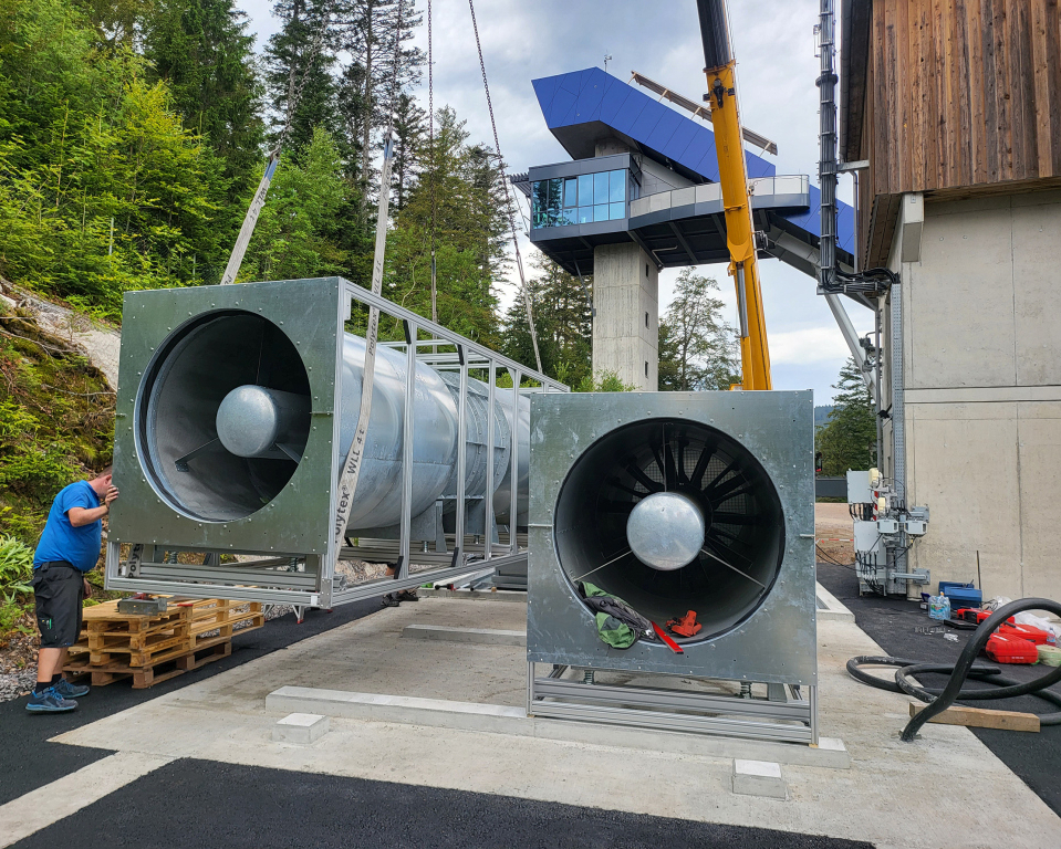 Endmontage des Windkanals im Adlerstadion in Hinterzarten: Die beiden Axialventilatoren werden auf die vorbereitenden Fundamente montiert.