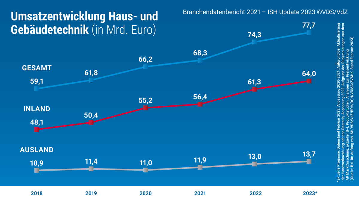 Für 2023 werden steigende Umsätze in Höhe von 77,7 Mrd. € (+4,5 %) erwartet. Allerdings wird das Umsatzwachstum in 2023 voraussichtlich schwächer ausfallen als im Jahr 2022. Die Gründe dafür liegen insbesondere in der konjunkturellen Abkühlung im Neubau von Ein- und Zweifamilienhäusern. Auch der Aufschub von nicht zwingend notwendigen Sanierungen im Bad führt zu einer schwächeren Nachfrage. Gestiegene Preise für Baumaterialien und Zinsanstiege drosseln die Neubauvorhaben merklich. Gleiches gilt für Investorenprojekte im Inland.