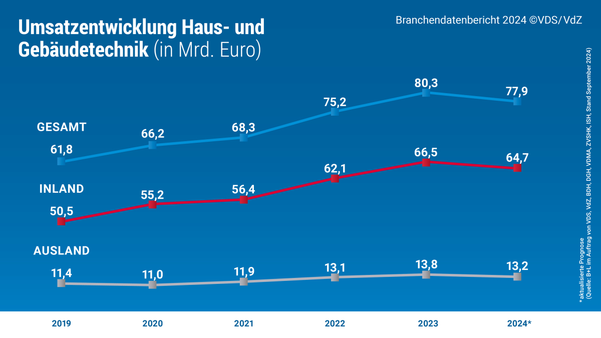 Die Branchendaten Haus- und Gebäudetechnik bilden die aktuellen Entwicklungen der Bereiche Sanitär, Heizung, Lüftung und Klima ab. Die Erhebung erfolgt im Auftrag der VdZ – Wirtschaftsvereinigung Gebäude und Energie e.V., VDS – Vereinigung Deutsche Sanitärwirtschaft e.V., BDH – Bundesverband der Deutschen Heizungsindustrie e.V., DG Haustechnik – Deutscher Großhandelsverband Haustechnik e.V., VDMA – Verband Deutscher Maschinen- und Anlagenbau, ZVSHK – Zentralverband Sanitär Heizung Klima sowie unter Mitarbeit der ISH. Die Branchendaten werden seit dem Jahr 2020 von der B+L Marktdaten GmbH erhoben.