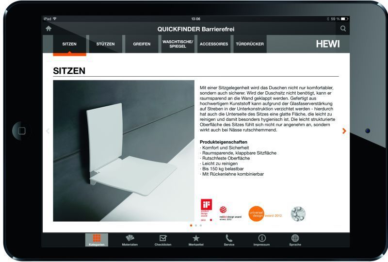 Hewi-App „Quickfinder Barrierefrei“Die Hewi-App „Quickfinder Barrierefrei“ ermöglicht die schnelle Suche nach passenden Produktlösungen für das Bad. Anhand von Funktionsbereichen im Sanitärraum, wie beispielsweise Waschtisch, WC und Dusche, kann gezielt nach geeigneten Produkten gesucht werden. Hewi bietet modulare Systemlösungen von Comfort bis Care, die für Menschen jeden Alters nutzbar sind. Diese Bandbreite bildet die App mit einer gezielten Auswahl des Portfolios ab. Die App kann als Beratungstool während eines Kundengespräches eingesetzt werden. Ausgewählte Produkte können unkompliziert zu Merkzetteln zusammengestellt...