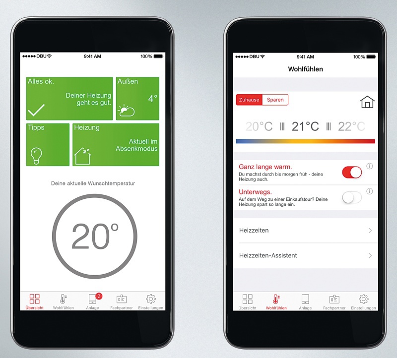 Ferneinstellung von Viessmann-WärmeerzeugernÜber die grafische Oberfläche der „ViCare“-App ist die Bedienung der Heizung ganz intuitiv möglich. Mit einer Wischbewegung über das Display wird die gewünschte Raumtemperatur gewählt, und per Fingertipp ist zwischen Normal- und Partybetrieb („Ganz lange warm“) umgeschaltet.